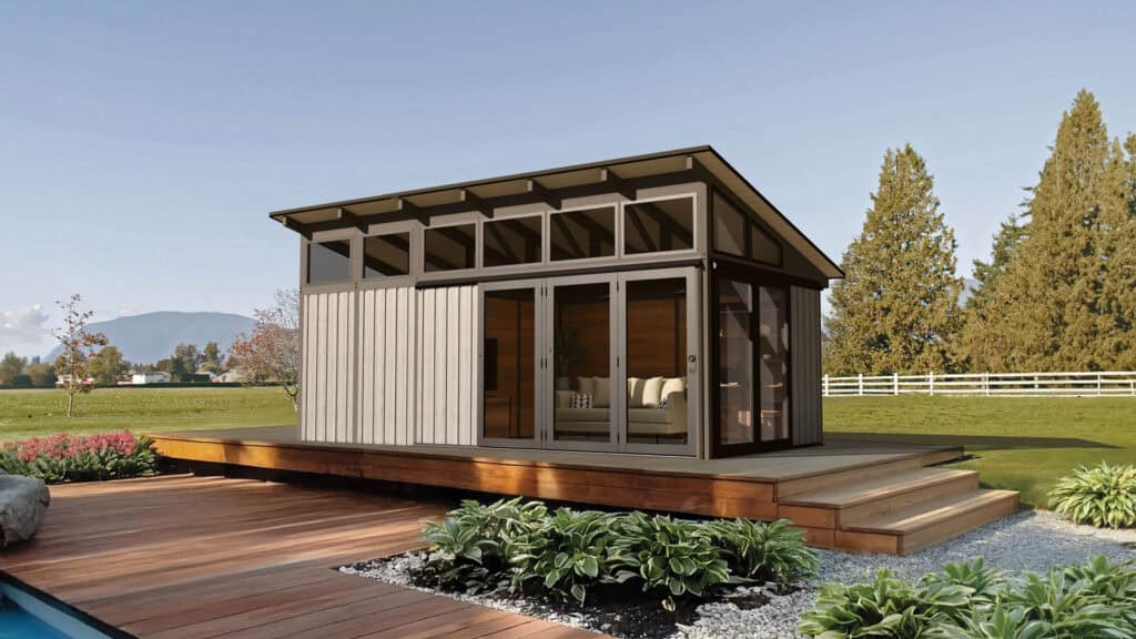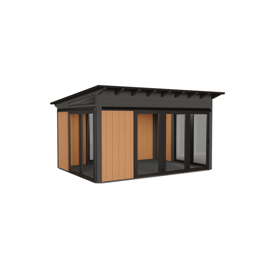 Step into seamless indoor-outdoor living with the Oslo 11×14. Its modern single-slope roof design invites natural light through large windows, complemented by large timber beams.