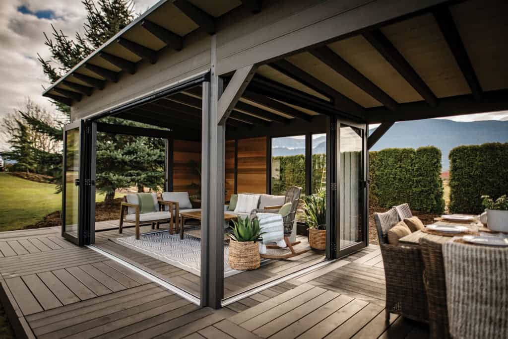 Profitez d’un maximum d’espace et de ventilation avec trois systèmes de portes coulissantes et pliantes, tandis que les portes en verre trempé à cadre d’aluminium offrent une polyvalence remarquable avec des ouvertures libres de 120 et 80 po. Que ce soit comme pool house, salon extérieur, salle à manger ou bureau dans la cour arrière, le Duke offre le cadre parfait.